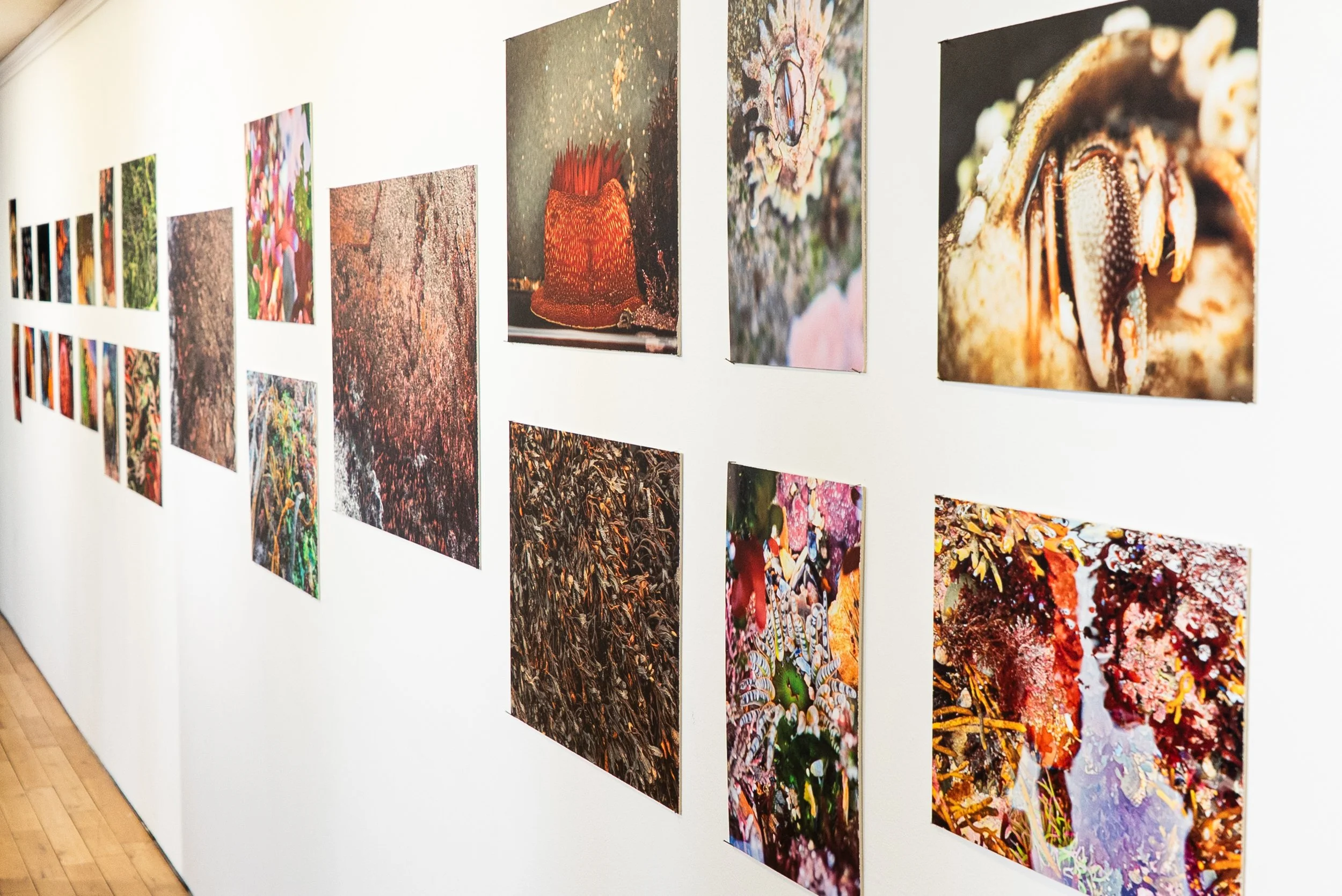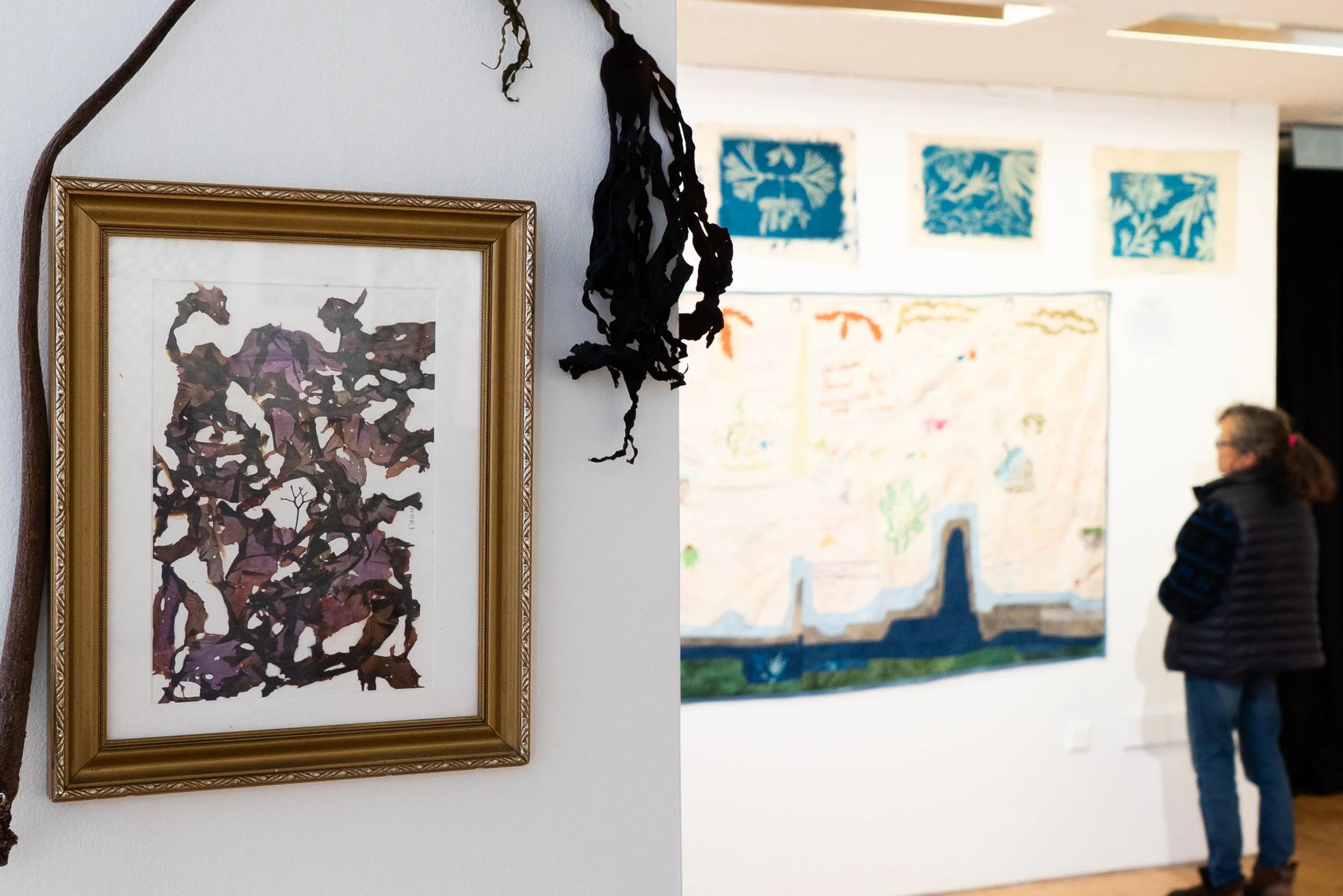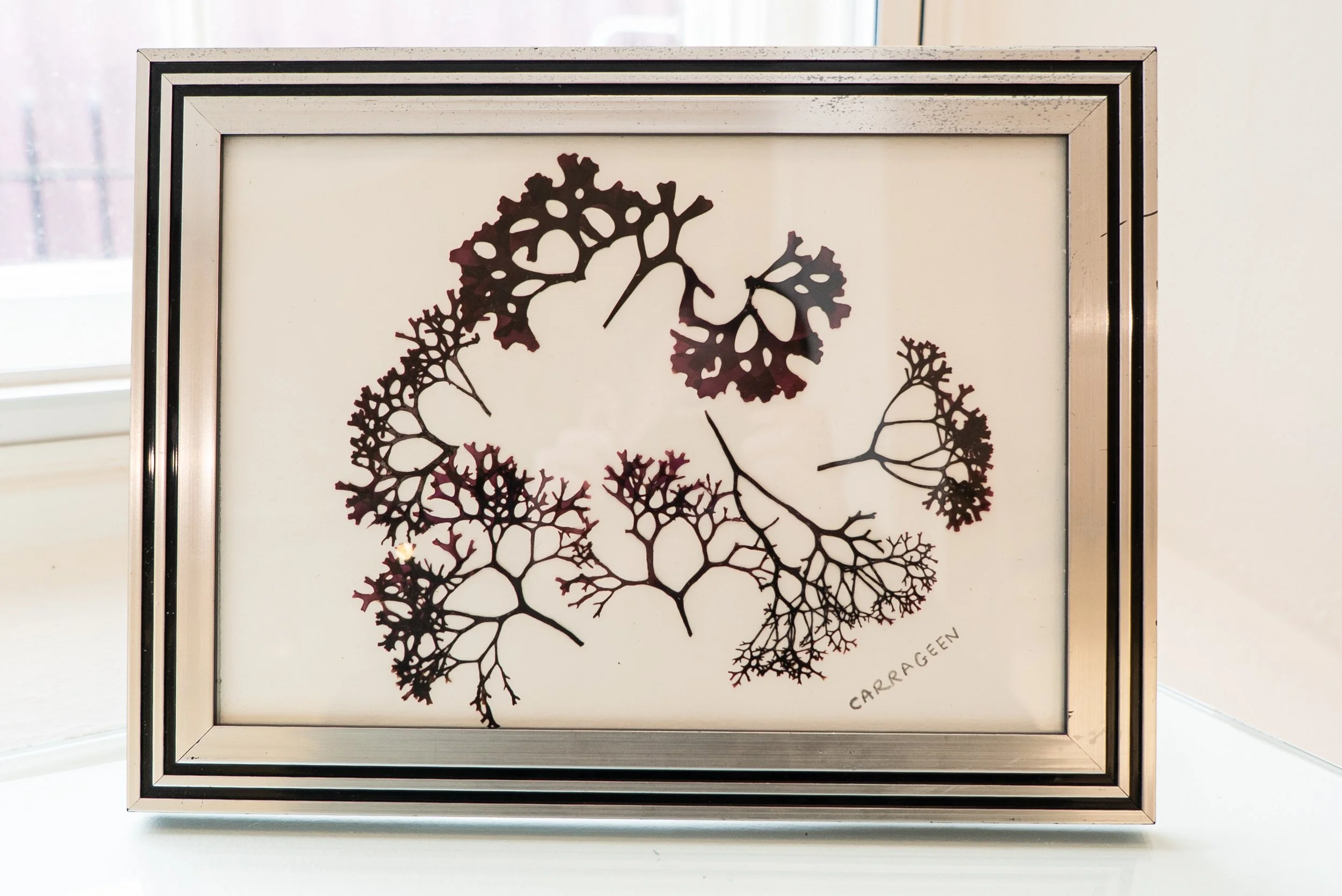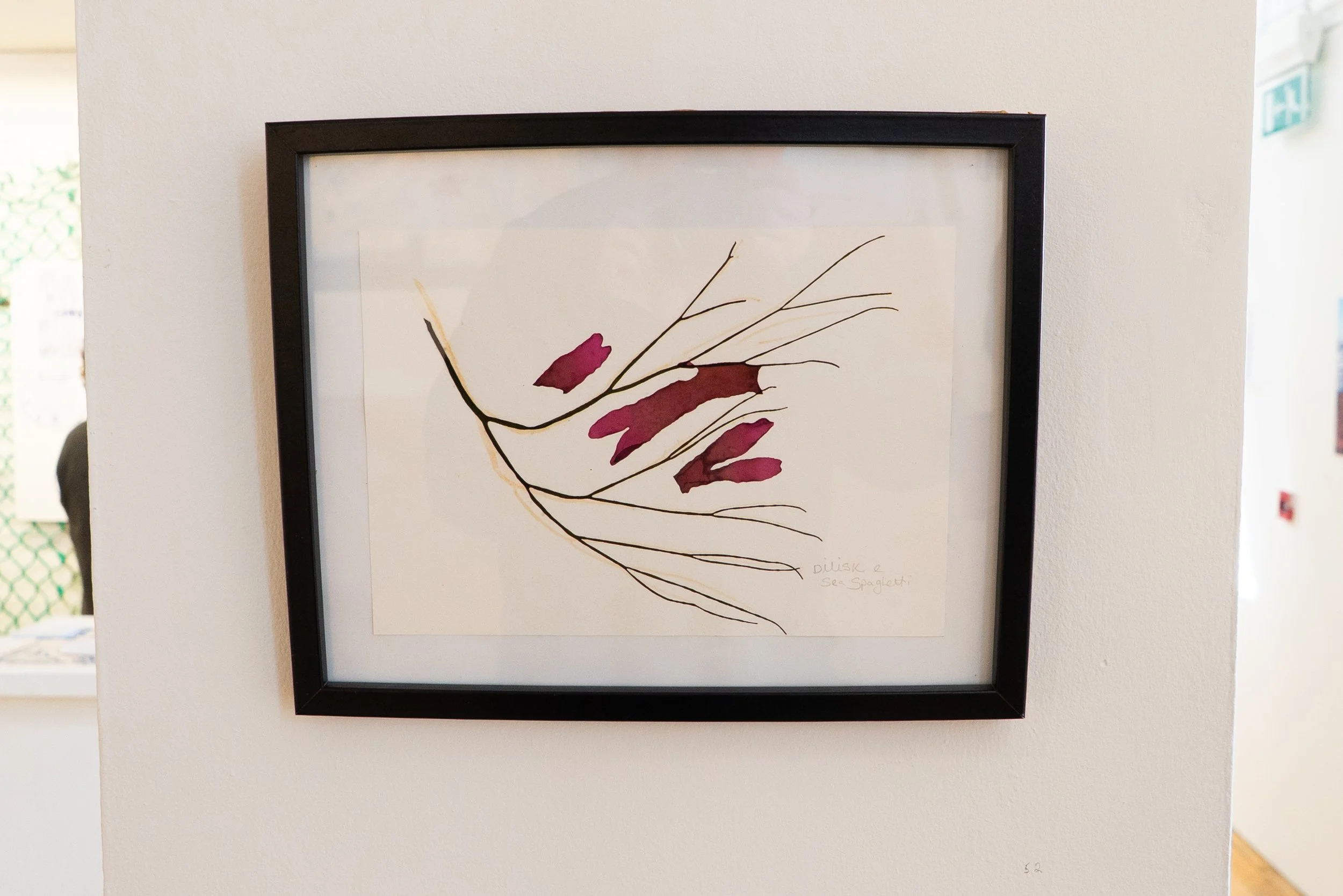 Seaweed pressings by Oonagh O’Dwyer, framed and displayed carefully in the space.