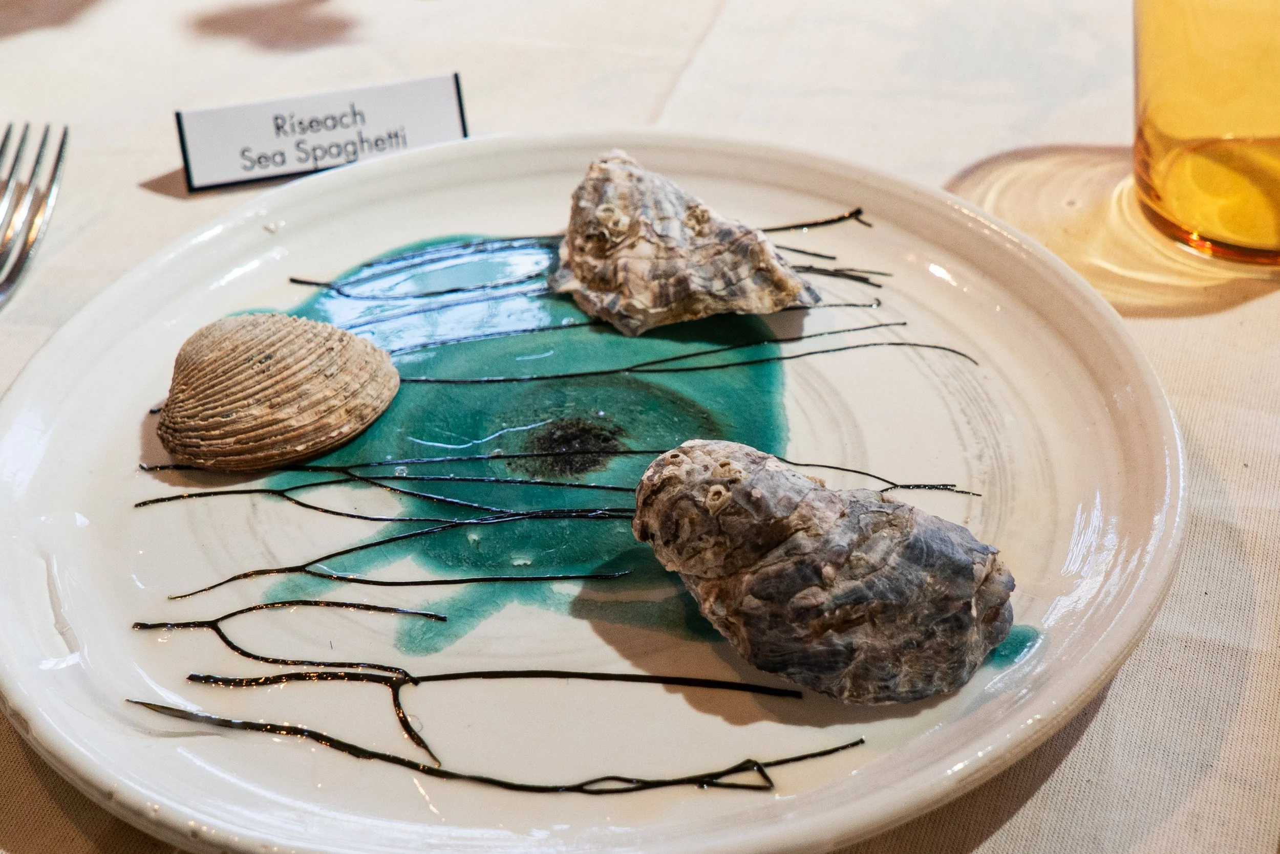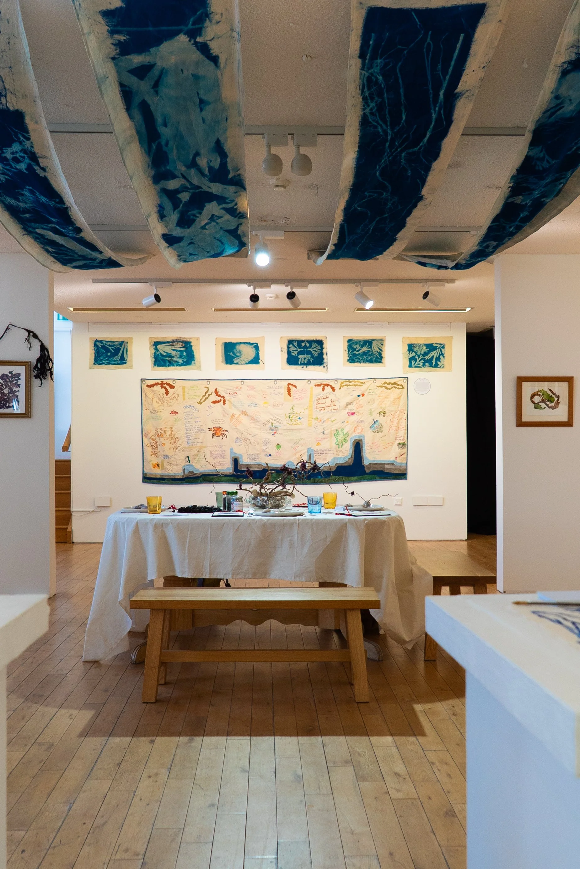 The centrepiece of the exhibition, our dining table featuring a seaweed recipe book and edible dried seaweed sample.